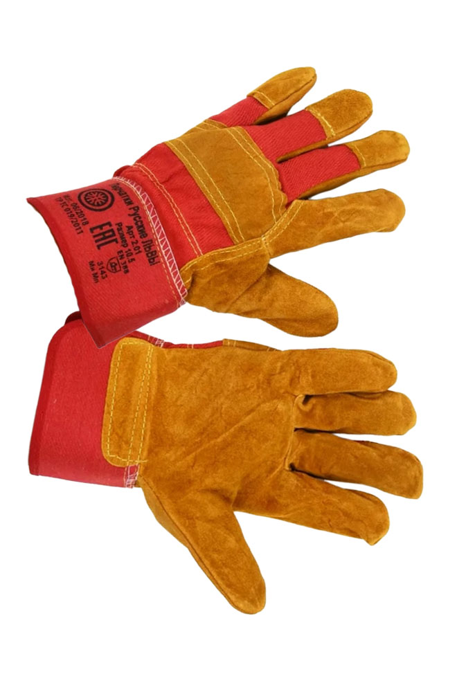 Перчатки из 100% кожевенного спилка сорта КРС с усилением на ладонной части и пальцах дополнительным слоем кожи. Манжеты крага, швы двойные.
